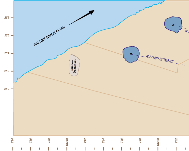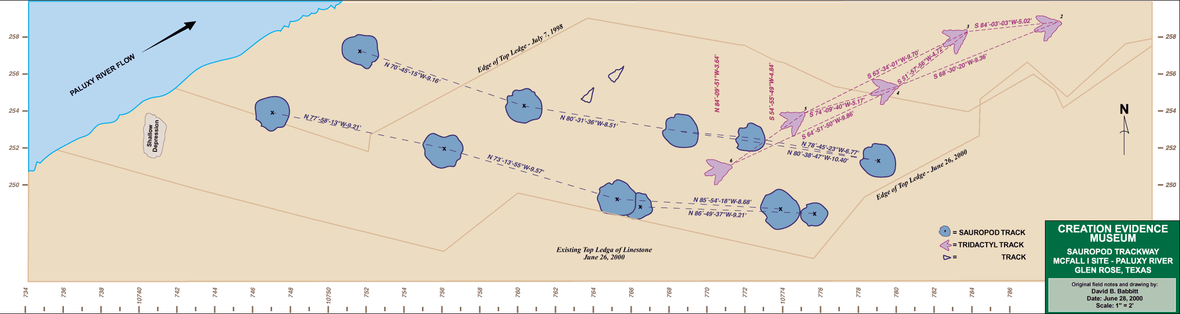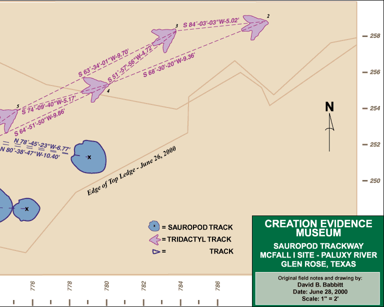 The drawing below illustrates the location of the new tracks discovered by the Creation Evidence team! Click on the image for a full size layout of the trackway.(2307 x 614 pixels), or click on the desired segment below the drawing. Each segment 768 pixels by 614 pixels.